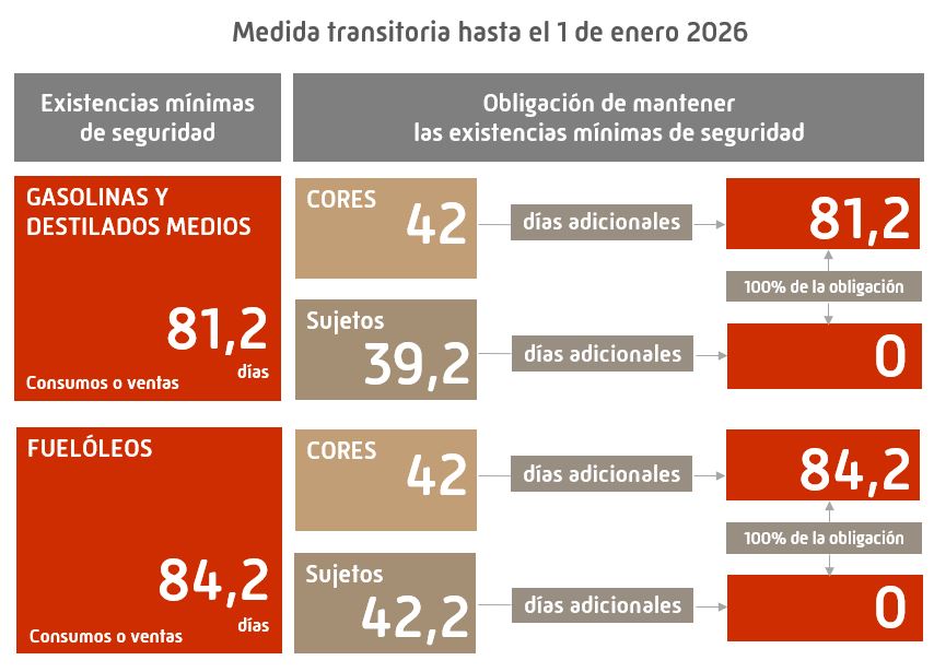 Finalmente, la Orden TED/533/2025, de 27 de mayo, restableció la obligación de mantenimiento de existencias estratégicas por parte de CORES a partir del 31 de mayo de 2025, y de existencias mínimas de seguridad para los sujetos obligados a partir del 1 de enero de 2026. De este modo, se restauró la obligación en los 92 días previstos en el RD 1716/2004, de 23 de julio. Puede consultar más información aquí.
